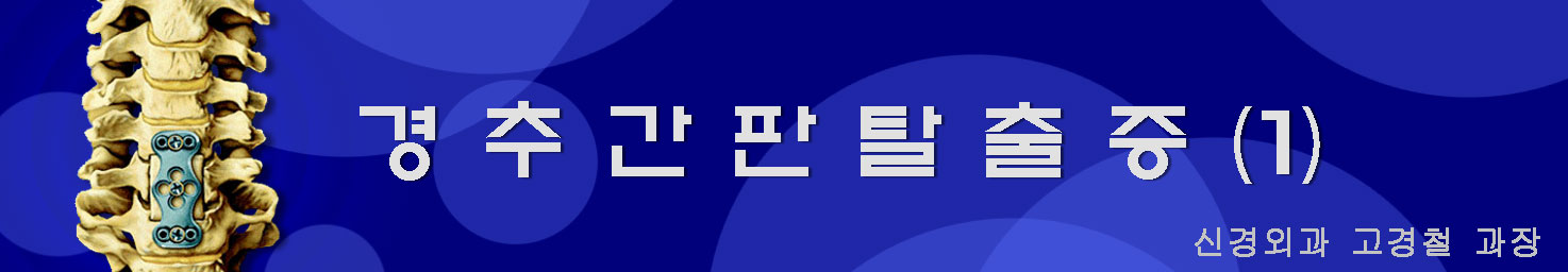 외 상에 의해 갑자기 생기는 수도 있지만 주로 퇴행성 변화에 의하여 서서히 발생하는 경우가 많습니다. 디스크란 등뼈 사이에서 충격을 흡수 하는 기능을 하는 것으로 일종의 물렁뼈입니다. 이 물렁뼈는 두 가지 구조로 이루어져 있는 데 딱딱한 섬유륜이 바깥쪽에 있고 그 안에 말랑말랑한 수핵이 들어 있습니다. 섬유륜을 자동차 타이어의 고무바퀴에 비유한다면 수핵은 공기가 들어 있는 튜브에 해당됩니다. 그러므로 고무바퀴가 흠이나 틈이 발생하면 튜브가 빠져 나오는 것과 같이 섬유륜에 균열이 생기면 수핵이 삐져나와 척수강에 있는 신경과 척수를 누르게 되고 눌린 신경과 척수에 의해 증상이 발생하게 됩니다. 디스크는 사람이 생활을 하면서 충격을 받으면 서 조금씩 물 성분이 빠져 노인이 되면 푸석푸석할 정도로 변하게 됩니다. 사람이 나이가 들면서 생기는 몸의 변화를 퇴행성 변화라고 하는데 이러한 디스크의 변성과정도 일종의 퇴행성 변화입니다. 사람의 등뼈는 20세까지 성장하지만 디스크는 10대 후반부터 변성이 시작되며 변성의 정도는 그 사람의 생활양상, 습관 ,활동정도, 자세 등과 관련이 있습니다. 다시 말하면, 무거운 물건을 들거나 자세가 삐딱하거나 장시간 같은 자세를 계속 유지하게 되면 그렇지 않은 사람보다 디스크의 변성은 심하게 됩니다. 디스크가 이러한 변성을 일으키면 바깥쪽에 있는 섬유륜에 금이 가게 되고 금이 점점 벌어지면 틈이 생깁니다. 수핵에 가해지는 압력이 어느 정도 이상이 되면 이를 견디지 못하고 섬유륜에 생긴 틈을 비집고 수핵이 자동차 타이어의 튜브처럼 고무바퀴의 틈새로 돌출하게 되는 것과 같이 신경이 지나가는 척수강으로 삐져나오게 되며, 이때에 압박되는 신경과 척수에 의해 증상이 발생하게 됩니다. 또한 디스크가 변성을 일으키면 물 성분이 줄어들어 전체적인 디스크의 양이 줄어 그 위 아래사이의 공간이 줄어들어 뼈끼리 부딪히게 되고 등뼈의 활동이 많아지게 되면 군 뼈가 자라나게 되는 데 이것을 골극이라 합니다. 예를 들면 일을 많이 한 분들의 손을 보면 손마디가 굵어진 것을 볼 수 있습니다. 이것은 일을 많이 하면 뼈가 자극을 받아 두꺼워지기 때문인데 등뼈사이에서도 이렇게 뼈가 굵어지는 현상이 생깁니다. 등뼈에서는 그 속에 신경이 지나가는 척추강이 있기 때문에 뼈가 굵어지면 신경이 지나가는 길은 그만큼 좁아져 신경이 눌리게 되는 것입니다. 이렇게 퇴행성 변화에 의해 발생한 디스크를 골극이 형성되어 딱딱하여 경성 디스크라 하며 주로 중년에 발생합니다. 반면에 외상에 의해 생기는 경우는 어느 나이에서도 발생하며 말랑말랑하여 연성 디스크라 합니다.