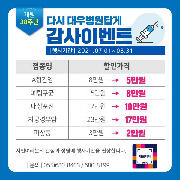 예방접종 할인 이벤트 연장(8.31까지) 페이지 정보 건강증진센터 작성일21-07-13 10:10 조회5,330회 댓글0건 본문 여러분의 성원에 힘입어 대우병원이 예방접종 할인 이벤트를 연장합니다~ 내용을 참고하시기 바랍니다. 이전글 다음글 목록