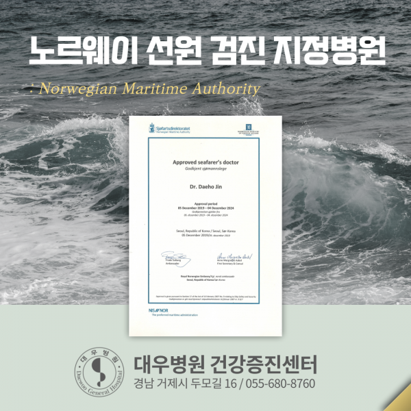 Norwegian maritime authority 검진지정병원 페이지 정보 건강증진센터 작성일21-07-23 13:38 조회5,442회 댓글0건 본문 대우병원은 노르웨이 대사관에서 지정한 Norwegian maritime authority 선원검진을 실시하고 있습니다.많은 관심 바랍니다~ 다음글 목록