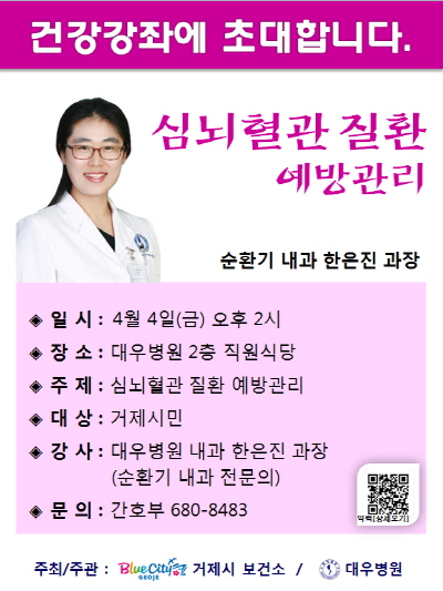 [강좌] 거제시민 대상 - 심뇌혈관질환예방관리 페이지 정보 대우병원 작성일14-03-27 15:50 조회76,717회 댓글0건 본문 [강좌] 거제시민 대상 - 심뇌혈관질환예방관리 이전글 다음글 목록