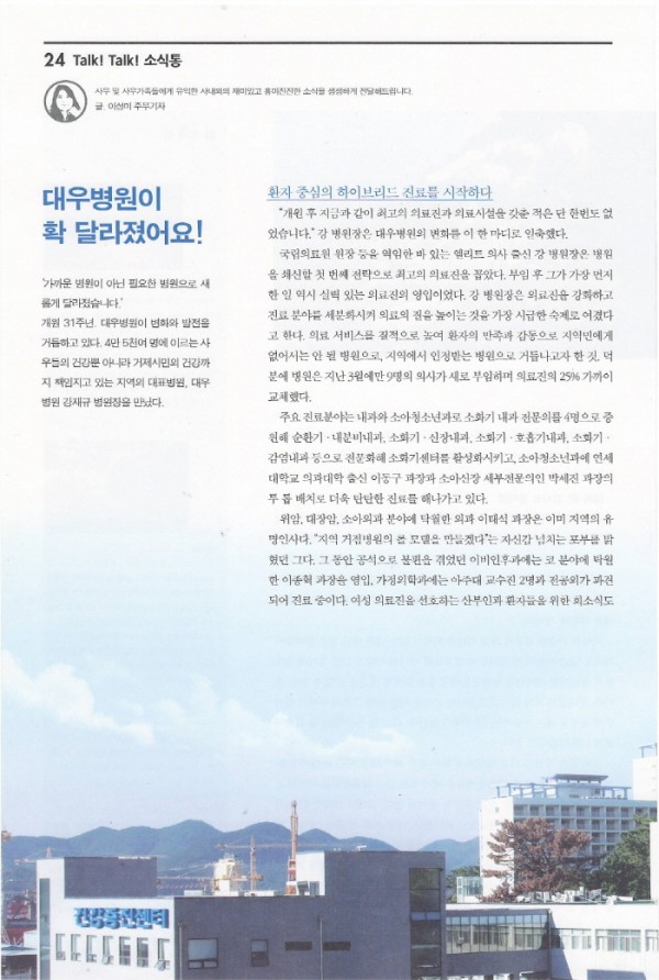 [기사] 대우조선해양 사보 "해오름터플러스" -병원장 인터뷰 페이지 정보 대우병원 작성일14-05-08 09:52 조회75,667회 댓글0건 본문 [기사] 대우조선해양 사보 "해오름터플러스" -병원장 인터뷰 이전글 다음글 목록