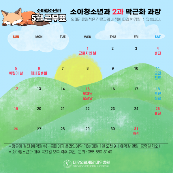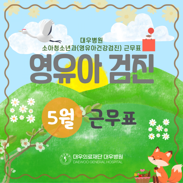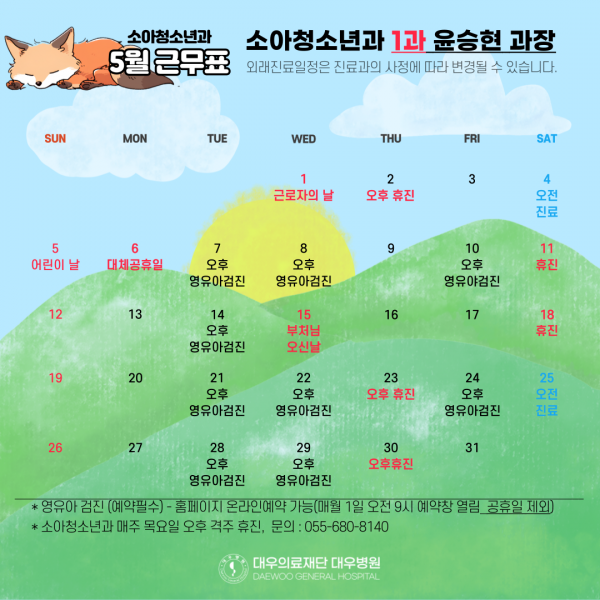 소아청소년과 (영유아검진) 2024년 5월 근무표 페이지 정보 대우병원 작성일24-04-26 10:55 조회23,611회 댓글0건 본문 소아청소년과 (영유아검진) 2024년 5월 근무표 이전글 다음글 목록
