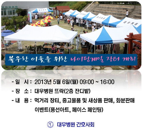 [안내] 대우병원 간호사회 나이팅게일 장터 개최 페이지 정보 대우병원 작성일13-04-30 00:28 조회97,853회 댓글0건 본문 [안내] 대우병원 간호사회 나이팅게일 장터 개최 이전글 다음글 목록