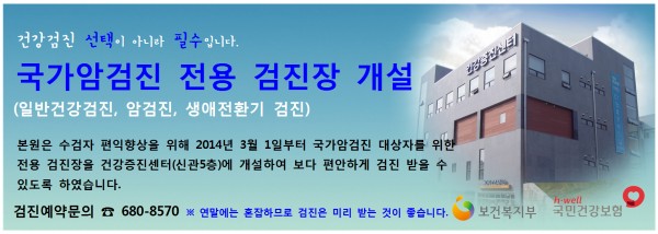 [안내] 국가암검진 전용 검진장 개설 페이지 정보 대우병원 작성일14-03-13 10:37 조회100,221회 댓글0건 본문 본원은 수검자 편익향상을 위해 2014년 3월 1일부터 국가암검진 대상자를 위한 전용 검진장을 건강증진센터(신관5층)에 개설하여 보다 편안하게 검진 받을 수있도록 하였습니다. 이전글 다음글 목록